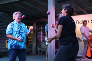 Her band rounds out the sound expertly, to audience members used to hearing her solo, or with just Roxanne on recorder and harmony vocals. Her bass player (the world-famous, or maybe, shall we say, Cape-famous Ron Siegel) climbs up on his doghouse, adding to that vaudeville feel. (See pictures!) Members of the audience sing along; they make crazy vocalizations that I don't know how to describe (how do they do that?); they do their own expert juggling (again, see pictures!); they leave the show with huge smiles on their faces!